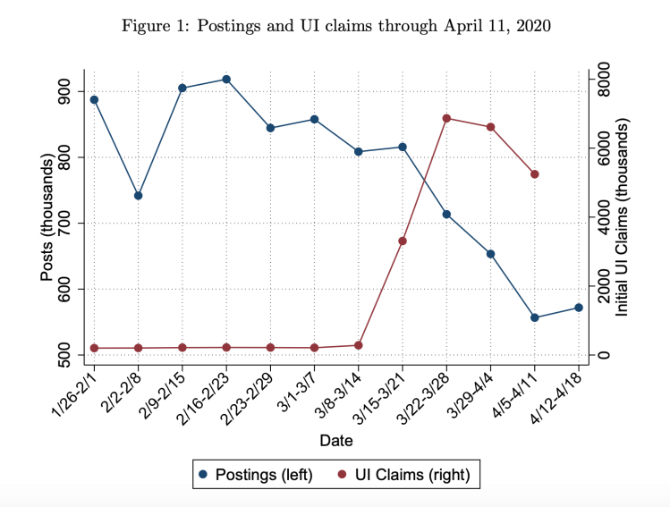 1. Vacancy postings collapsed at the same time as initial claims spiked, declining by 30% of the level at the beginning of the year. The observed decline in vacancies posted is roughly two-thirds of that observed in the U.S. during the Great Recession.