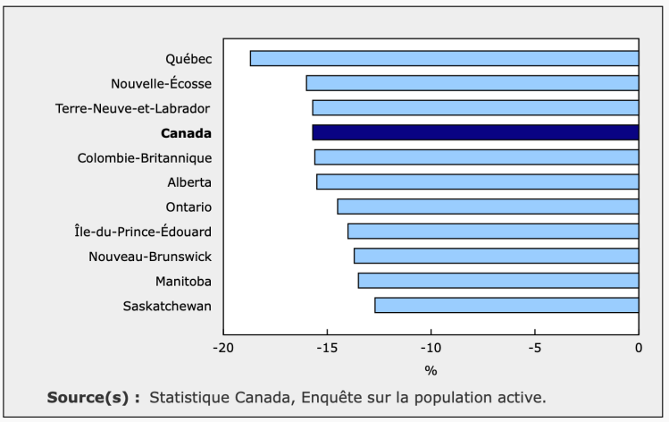 Le taux de chômage a augmenté de façon marquée dans toutes les provinces en avril. Au Québec, le taux s’est établi à 17,0 %. Il s’agit du taux le plus élevé enregistré dans la province depuis 1976, année où des données comparables ont commencé à être publiées, et du taux le plus élevé parmi les provinces. Le nombre de chômeurs a augmenté plus rapidement (+101,0 % ou +367 000) au Québec que dans les autres provinces; la hausse du nombre de personnes mises à pied temporairement (données non désaisonnalisées) a été proportionnellement plus élevée au Québec que dans les autres provinces, tandis que l’augmentation du nombre de personnes inactives a été proportionnellement plus faible.