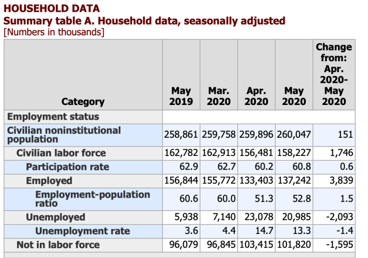 The unemployment rate declined by 1.4 percentage points to 13.3 percent in May, and the number of unemployed persons fell by 2.1 million to 21.0 million. Reflecting the effects of the coronavirus pandemic and efforts to contain it, the unemployment rate and the number of unemployed persons are up by 9.8 percentage points and 15.2 million, respectively, since February. (See table A-1. For more information about how the household survey and its measures were affected by the coronavirus pandemic, see the box note at the end of the news release.)