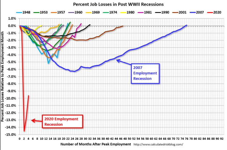 The current employment recession is by far the worst recession since WWII in percentage terms, and the worst in terms of the unemployment rate.