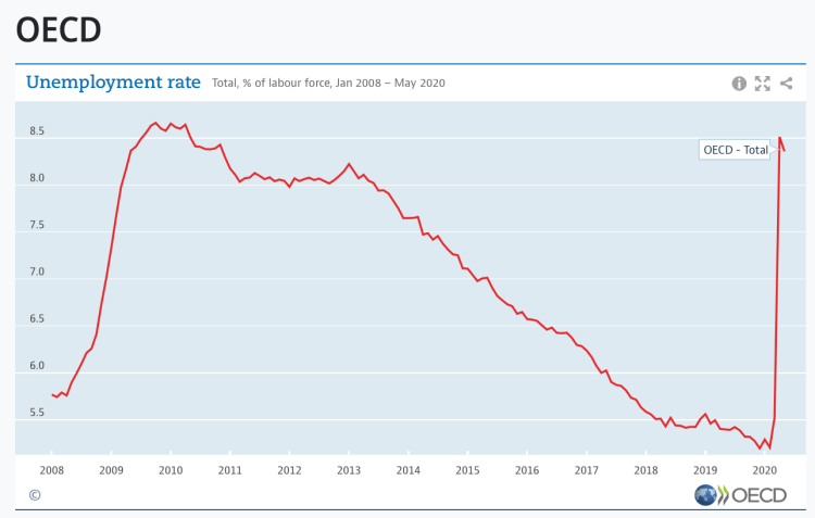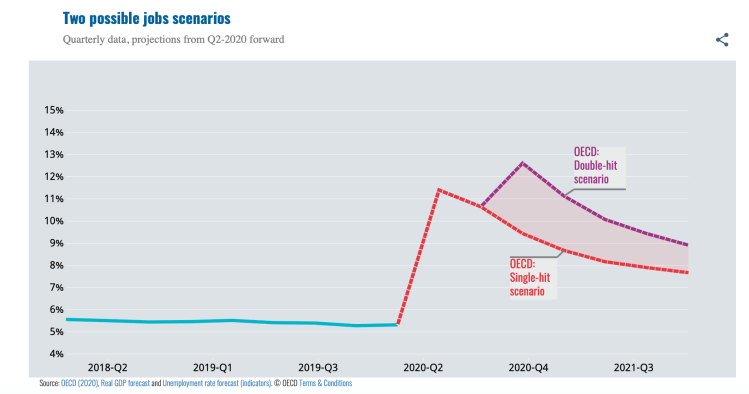 Unemployment is projected to reach nearly 10% in OECD countries by the end of 2020, up from 5.3% at year-end 2019, and to go as high as 12% should a second pandemic wave hit. A jobs recovery is not expected until after 2021.