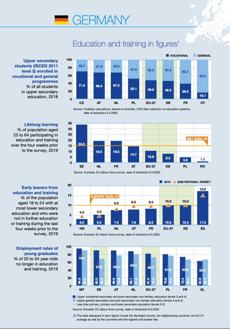 Germany’s VET is a successful model, largely based on the dual system (apprenticeship) leading to high-quality vocational qualifications, valued on the labour market. Apprenticeship enables smooth education-to-work transitions, resulting in low youth unemployment: in 2019, 5.8% of those aged 15 to 24 versus 15.1% in the EU-27.