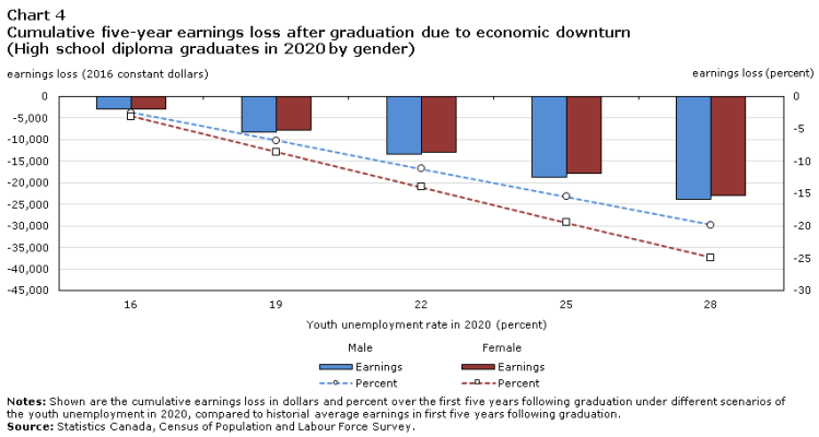 Under a scenario where the youth labour market recovers very quickly (i.e. the youth unemployment rate will be 16.0% this year), five year losses could be less than $6,000 for all groups, or less than $1,200 per year (Chart 2, 3, and 4).