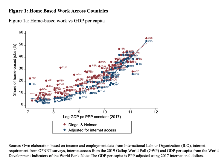 This paper presents new estimates of the share of jobs that can be performed from home. The analysis is based on the task content of occupations, their information and communications technology requirements, and the availability of internet access by country and income groupings.