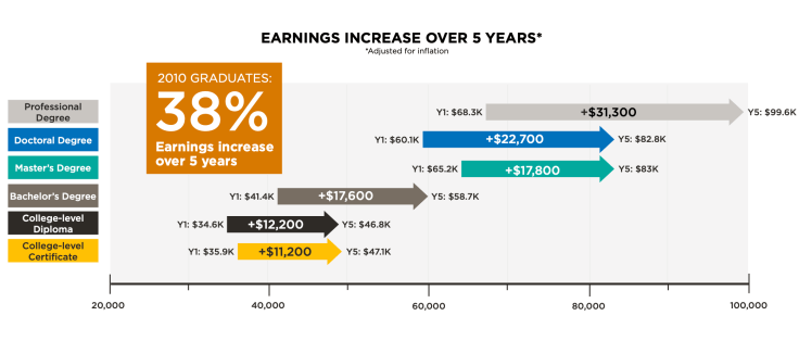 - Earnings vary by credential, but for all 2010 PSE graduates, real earnings grew from $43,100 to $59,300, an increase of 8 .4% per year (38% in total) from 2011 to 2015.