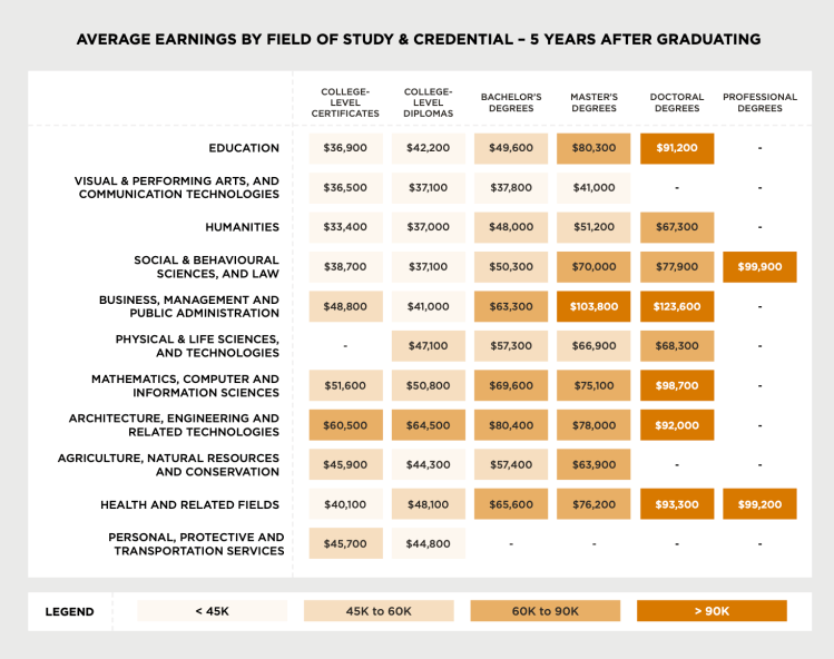 - Five years after gradation, earnings vary widely by field of study within credentials, with the top fields earning between 40% and 60% more than graduates from fields with the lowest earnings.