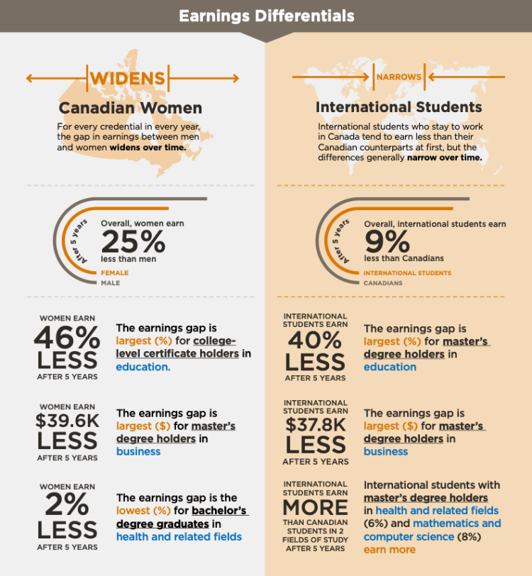- International students who stay and work in Canada earn less than their Canadian counterparts, but the differences narrow over time.