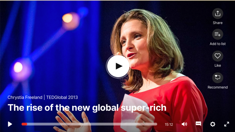 Technology is advancing in leaps and bounds — and so is economic inequality, says writer Chrystia Freeland. In an impassioned talk, she charts the rise of a new class of plutocrats (those who are extremely powerful because they are extremely wealthy), and suggests that globalization and new technology are actually fueling, rather than closing, the global income gap. Freeland lays out three problems with plutocracy … and one glimmer of hope.