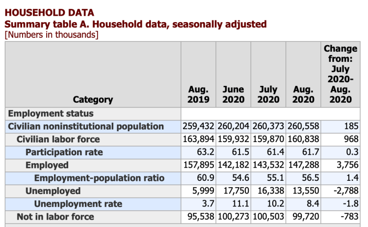 In August, the unemployment rate declined by 1.8 percentage points to 8.4 percent, and the number of unemployed persons fell by 2.8 million to 13.6 million. Both measures have declined for 4 consecutive months but are higher than in February, by 4.9 percentage points and 7.8 million, respectively. (See table A-1. For more information about how the household survey and its measures were affected by the coronavirus pandemic, see the box note at the end of this news release.)