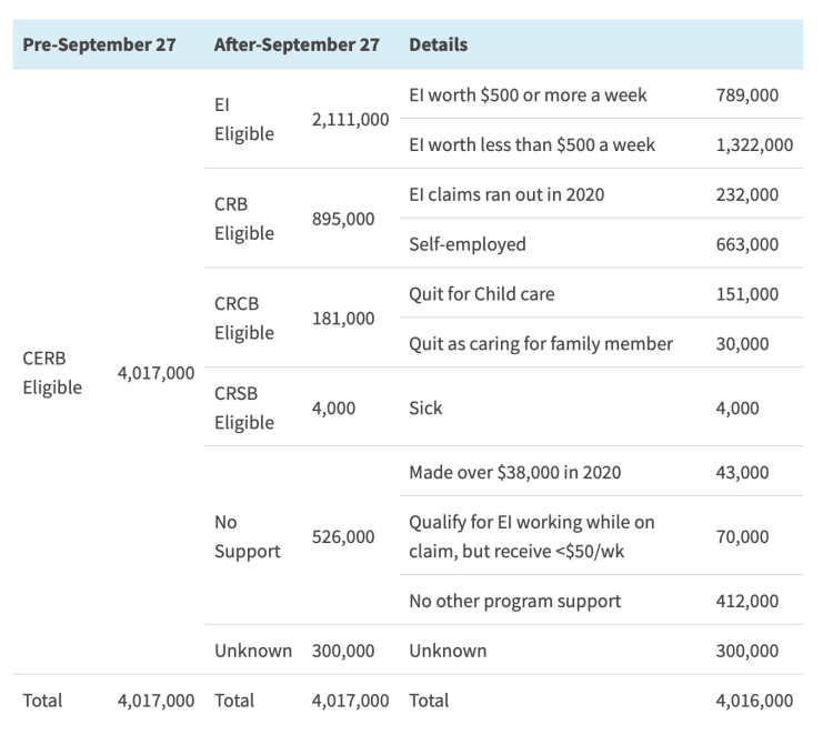 - Almost a half million—482,000—CERB recipients won’t transfer to anything else and will stop receiving federal income supports all together.