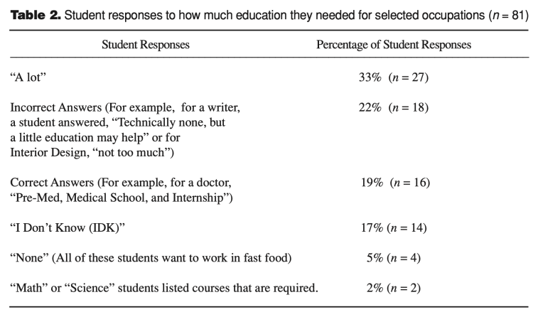 the students correctly knew the educational requirements for their chosen careers. Finally, this article provides suggestions and resources for teachers to incorporate career exploration in middle school.