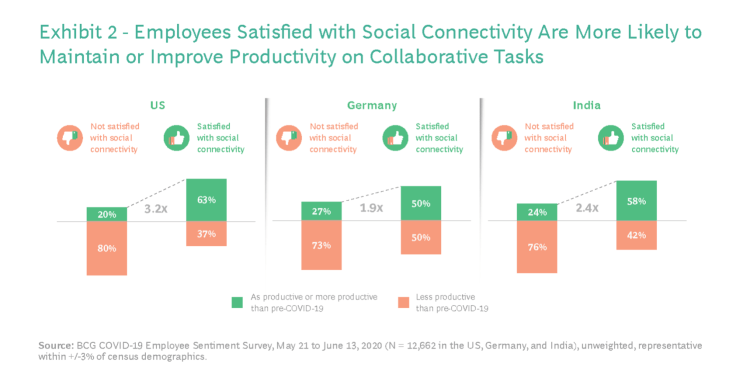 To assess employee sentiment on these changes, from the end of May through mid-June we surveyed more than 12,000 professionals employed before and during COVID-19 in the US, Germany, and India. The respondents work in roles such as analysts, engineers, HR personnel, teachers, and health care providers (but generally not in jobs performed onsite such as cashiers or assembly line workers). We explored their attitudes toward flexibility, productivity (on individual, collaborative, and managerial tasks), well-being, career security, social connectivity, culture, learning and development, and the work tools they use.
