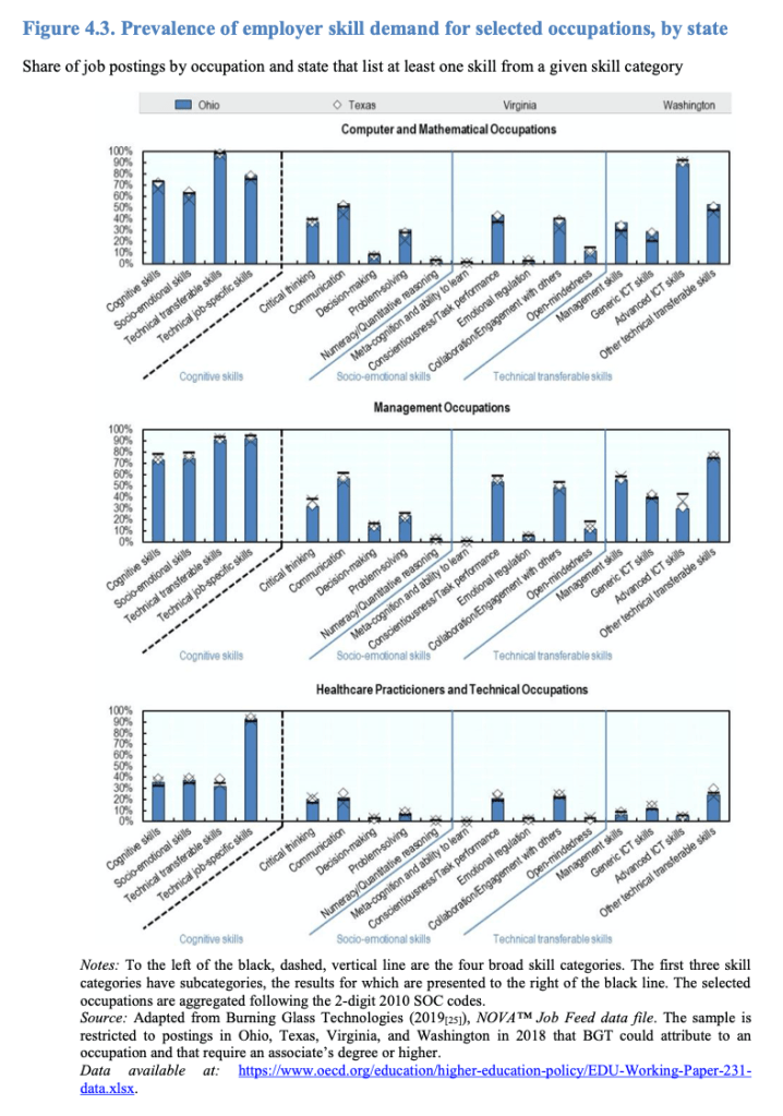 What skills do employers seek in graduates?Using online job posting data to support policy and practice in higher educationEmployers increasingly reach job seekers through online job postings, particularly for jobs requiring a higher education qualification. Job postings available online provide a rich source of real-time and detailed data on the qualifications and skills sought by employers across industries, occupations and locations. Using a sample of over 9 million job postings in four US states (Ohio, Texas, Virginia and Washington), this paper explores three questions. How does employer demand for graduate skills vary geographically, within and among occupations? For graduates in a general study field without a dedicated career vocational pathway, like sociology, what occupational clusters show evidence of employer demand, and what skills are sought? Given the high demand in the field of information and communications technology (ICT), are employers looking for ICT specialists open to hiring graduates from study fields other than ICT?