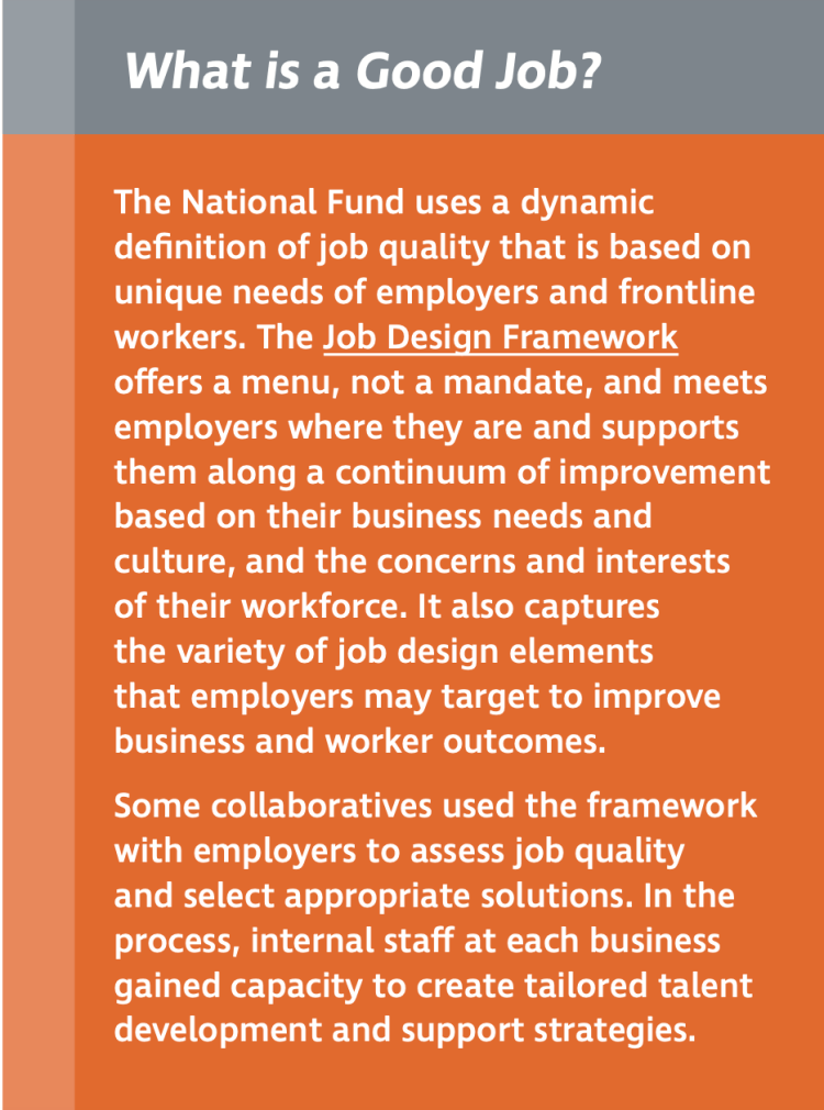 In 2014, as employers struggled to recruit and retain talent and a national conversation focused on job quality emerged, the National Fund saw an opportunity to serve employers and frontline workers through a different kind of workforce development strategy, one focused on improving the quality of frontline jobs and the career opportunities available to the workers in those jobs. It began partnerships with 11 of its regional workforce funder collaboratives to support them in learning how to implement good jobs strategies by engaging employers and working with them to support and advance frontline workers as a competitive business strategy.