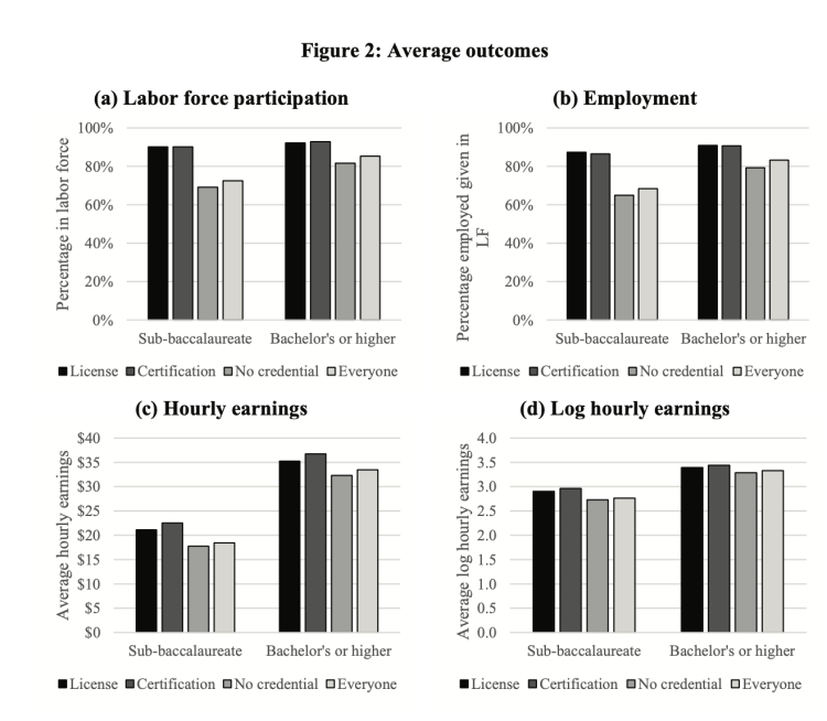 We find large, meaningful returns for entry into the labor force, employment conditional on being in the labor force, and earnings conditional on working. The effects tend to be larger for sub-baccalaureate, especially for the earnings. The large positive effects for sub-baccalaureate on earnings is notable, and not necessarily surprising, if the license are the objects of highest value to employers, with education serving more as a potentially correlated signal of quality.