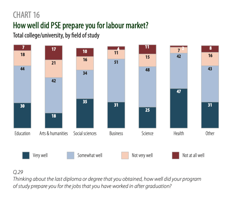 1) A majority of college and university graduates in all major fields of study say that their programs prepared them very or somewhat well for the jobs that they have worked in after graduation. However, the proportion of graduates saying they were very well prepared for their jobs is higher among those who completed their studies before 2000 than among more recent graduates.