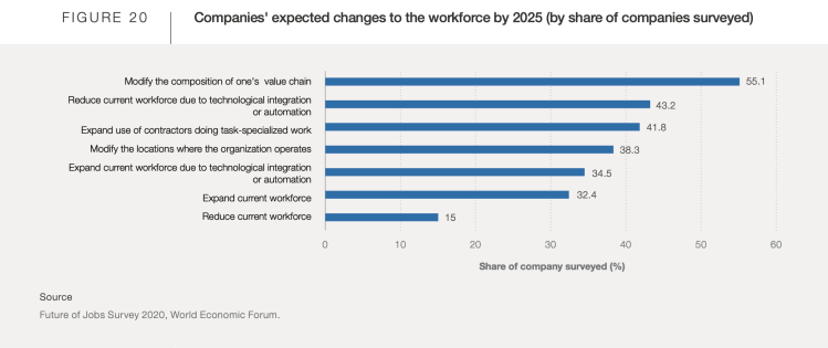 - Automation, in tandem with the COVID-19 recession, is creating a ‘double-disruption’ scenario for workers. In addition to the current disruption from the pandemic-induced lockdowns and economic contraction, technological adoption by companies will transform tasks, jobs and skills by 2025. Forty-three percent of businesses surveyed indicate that they are set to reduce their workforce due to technology integration, 41% plan to expand their use of contractors for task-specialized work, and 34% plan to expand their workforce due to technology integration. By 2025, the time spent on current tasks at work by humans and machines will be equal. A significant share of companies also expect to make changes to locations, their value chains, and the size of their workforce due to factors beyond technology in the next five years.