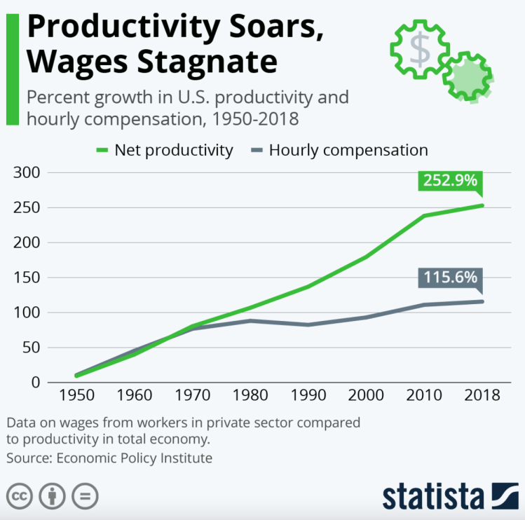 Between 1948-1979, the percent growth in productivity and wages were relatively similar, with an increase of 108 percent and 93 percent, respectively. The growth from 1979-2018, however, has been drastically different. While net productivity has continued to increase by an expected 70 percent, hourly compensation in the country is less than a fifth of that at just 12 percent.