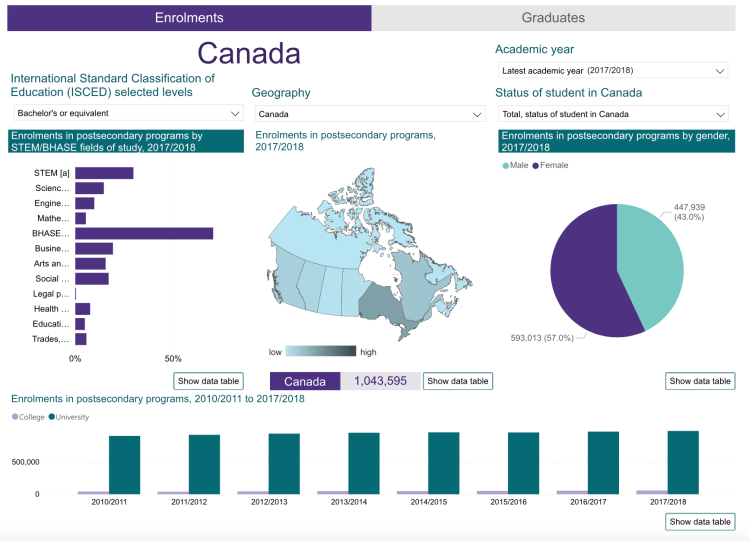 In the 2018/2019 academic year, over 2.1 million students were enrolled in Canadian public universities and colleges, up 1.8% from the previous year. This was attributable to a 16.2% increase (+47,952) in international student enrolments during the same time period, while enrolments by Canadian students edged down by 0.5% (-8,301).