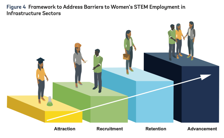 The report distills the findings from an extensive literature review, a global stocktaking exercise, key informant interviews, and five case studies in order to provide World Bank Group project teams with insights that they can use to support women’s STEM careers in infrastructure at each stage of their careers—from initial attraction to the sectors and job recruitment, to retention within organizations, and advancement to managerial and leadership roles.