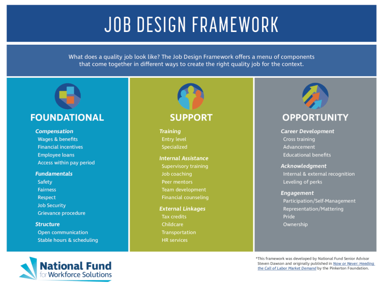 What does a quality job look like? The Job Design Framework allows you to choose the combination of items that best fit the needs of your business and your employees. Think of it as a menu rather than a mandate. Employers should discuss job design with frontline workers to identify the most impactful changes. A good job for one worker may not be a good job for another. But the better the job, the more likely an employer will attract and retain the best workers in a tight labor market.
