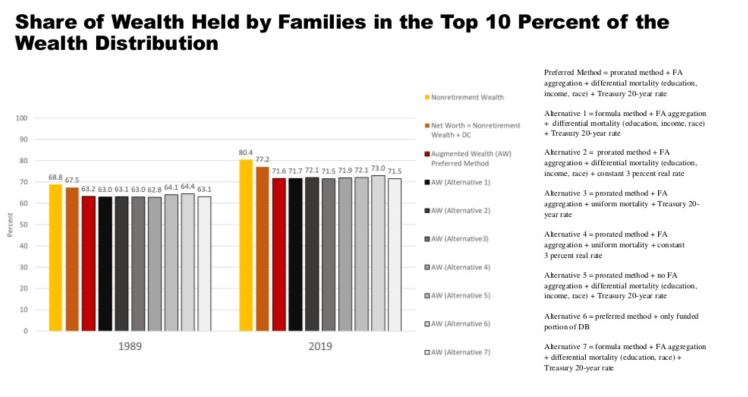 Between 1989 and 2019, retirement wealth became less equally distributed among families with different levels of education or income. Still, in 2019 as in 1989, retirement wealth, particularly DB assets, remained more equally distributed than nonretirement wealth among those families. In both 2019 and 1989, DB assets offset some of the inequality in net worth among families with different levels of education or income. The shift in pension coverage from DB to DC plans might account for some of the increases in the Gini coefficient of augmented wealth and in the share of augmented wealth held by the families in the top 10 percent of the distribution. Retirement Wealth Among Education and Income Groups.