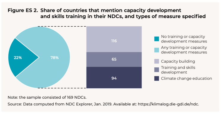 The green transition is conditional on countries’ implementation of their com- mitments to the Paris Agreement. Since that agreement was reached, the Intergovernmental Panel on Climate Change (IPCC) has called for the acceleration of measures to limit global warming further, to 1.5°C above pre-industrial levels, in order to minimize the severe consequences of climate change for people, livelihoods, ecosystems and economies (IPCC, 2018). Countries have committed themselves to the implementation of the Paris Agreement through nationally determined contributions (NDCs), so far submitted by 183 UN Member States, which stipulate the adaptation and mitigation measures they will take in targeted economic sectors. Two-thirds of these countries recognize in their NDCs the importance of capacity development and climate change literacy, but less than 40 per cent of NDCs globally include any plans for skills training to support their implementation, and over 20 per cent do not plan any human capital related activities at all (figure ES 2). This should set alarm bells ringing, for commitments in the energy, agriculture, waste, manufacturing, transport and tourism sectors set out in NDCs are all subject to the availability of relevant skills in these industries. Who other than women and men, workers and managers, will take investment decisions, change production processes, and install and maintain clean technology?