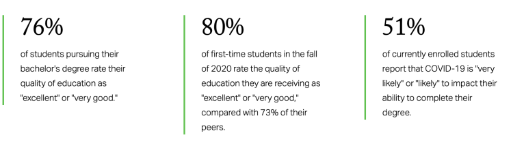 1 Most students pursuing their associate (72%) or bachelor’s degree (76%) rate the quality of their education as “excellent” or “very good.”