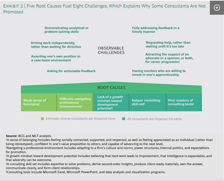 To understand why, we took an in-depth look at our own industry: management consulting. The study, conducted in partnership with Management Leadership for Tomorrow (MLT), looked across the management consulting industry to understand why consultants fall off the promotion track, and we found five root causes that impact all consultants, regardless of their backgrounds. Of those five, two causes—a weak sense of belonging and difficulty navigating professional environments—are particularly challenging for consultants from underrepresented racial and ethnic groups.