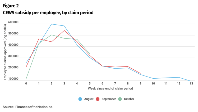 Perhaps recognizing the problems, Ottawa implemented reforms in September to reduce the subsidy rates and phase out the program over time. Examining the impact of the September reforms on claims allows us to develop an estimate of just how many jobs the program has saved overall.