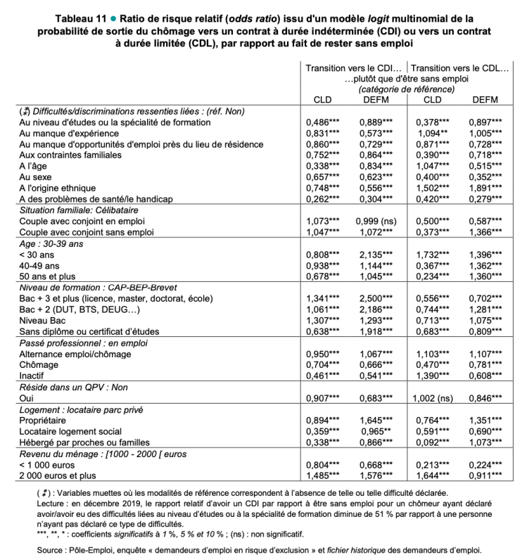 Conformément aux hypothèses de départ, les chômeurs appartenant à des catégories « vulnérables » composées des bénéficiaires du RSA, des personnes confrontées à des problèmes chroniques de santé ou des handicaps, surtout des chômeurs dits « de longue durée » sont confrontés à des difficultés certaines pour trouver un emploi et, quand ils en trouvent un, il est plus souvent précaire. Ces situations étant cumulatives, les bénéficiaires du RSA et les personnes ayant des problèmes de santé sont plus nombreuses parmi les chômeurs de longue durée. Le fait d’être plus intensément confrontés à des difficultés – subjectives ou objectives – qui entravent leur recherche d’emploi ou leur accès à l’emploi, s’accompagne d’un plus fort sentiment de discrimination, essentiellement basé sur des caractéristiques visibles. Si le niveau de formation reste toujours un rempart contre le chômage (moins pour les CLD cependant), la pauvreté relative (faible niveau de revenus du ménage, absence de logement individuel ou habitat social, résidence dans des quartiers défavorisés) pénalise ostensiblement la sortie du chômage.