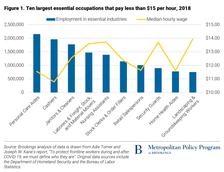 In 2018, 47.7 million U.S. workers were in occupations with a median wage of less than $15 per hour. Of these 47.7 million workers, 22.3 million were in occupations considered “essential” per Tomer and Kane’s analysis of Department of Homeland Security guidance.