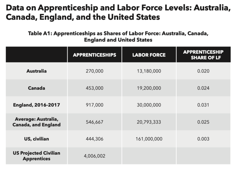A good deal of evidence suggests that apprenticeship programs are more cost-effective than academic-only approaches at raising skill levels, especially for employability and occupational skills. Yet the United States has lagged far behind other developed countries—countries like Germany and Switzerland, but also Australia, Canada, and England—in creating apprenticeships. In these countries, apprentices constitute about 2.5-3.0% of the labor force, or about 10 times the U.S. rate.