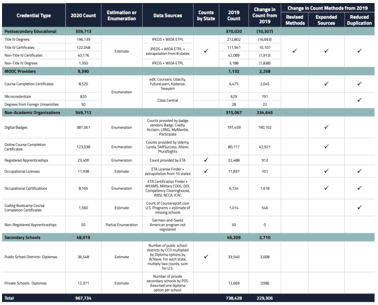 For this 2020 report, Credential Engine identifies 967,734 unique credentials in the United States, organized in 16 categories delivered through four types of education and training providers— postsecondary educational institutions, Massive Open Online Course (MOOC) providers, non-academic organizations, and secondary schools. On the left side of the findings in Table 1, we report by category the 2020 count numbers, the nature of the count; data sources; and availability of count by state. On the table’s right side, we indicate how and why each category’s count differs from 2019 (whether we revised accounting methods, expanded our data sources, and/or reduced duplicates in the count).