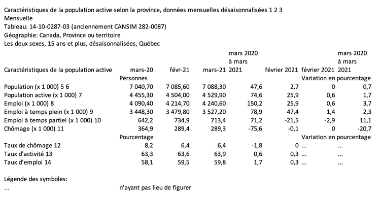 Extraits choisis par le Moniteur de l’emploi. Lire la suite @ Le Quotidien — Enquête sur la population active, mars 2021