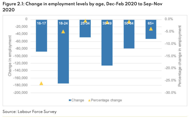 The report finds that young people have lost out in particular due to the specific sectoral and occupational effects of this crisis – and in particular impacts in hospitality, care services, leisure and construction. These employment changes have also translated into significantly different impacts for different groups of young people, with young men, Black and Asian people, and those living in southern England, Scotland and Wales appearing to have so far fared worst in this crisis.
