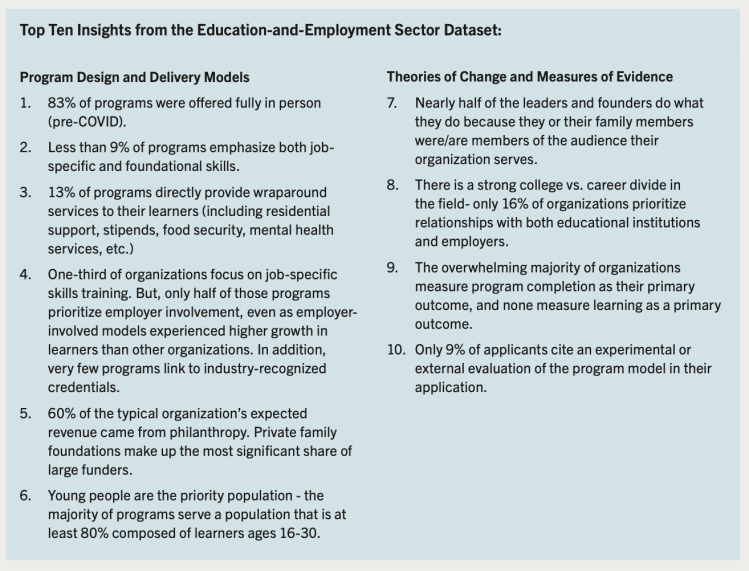 This report is an analysis of the education-and-employment sector landscape, using a novel dataset of organizations working at the intersection of education and employment. We answer two broad questions: 1) What are the characteristics of the education-and-employment sector? And 2) What are the most common program delivery methods, audiences, and outcomes?