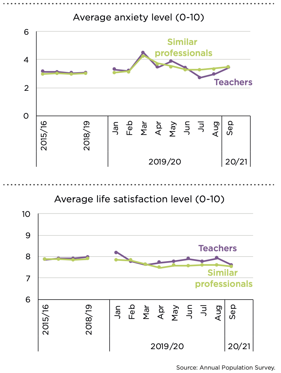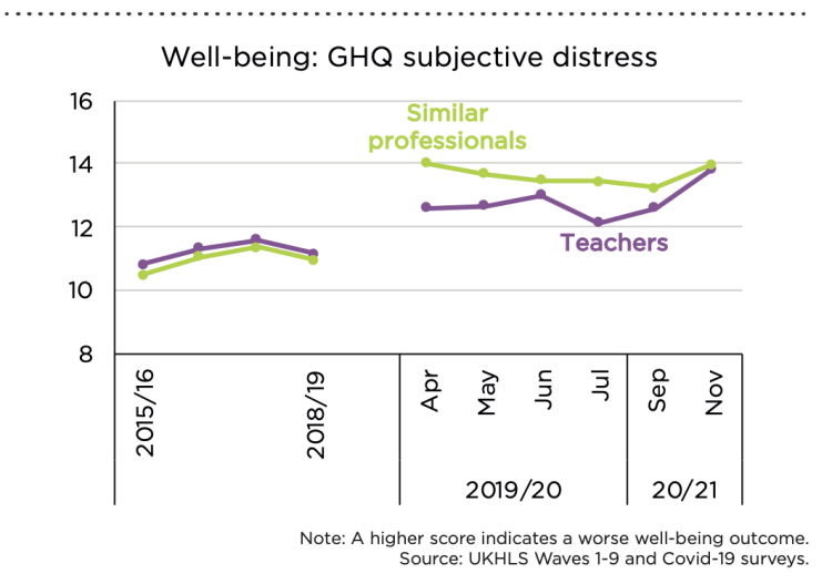 - Teachers’ well-being is likely to have been insulated to some degree by relatively high job security. Relatively high job security in teaching compared to an uncertain wider labour market has also led to a surge in applications to initial teacher training (ITT).