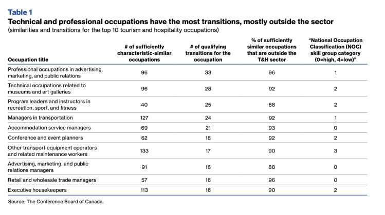 The COVID-19 pandemic has hit Ontario’s tourism and hospitality sector hard, with significant job losses and reduced prospects for near-term recovery. As part of the Tourism and Hospitality Emergency Response project initiated by the Ontario Tourism Education Corporation, Conference Board researchers examined 48 tourism-sector occupations and found that they have an average of nine potential job transition options.