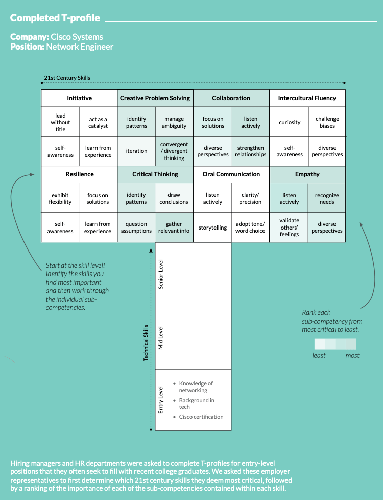 We intended the T-profile to be a tool to help us identify which of the Lab’s Badges colleges might offer. The T could very well stand for “transparency.” Meaning “readily understood, easily detected, obvious,” transparency, especially as it relates to 21st century skills, is a missing variable in what is becoming an increasingly nuanced matching process between prospective employee and hiring manager. Employers should clearly articulate the 21st century (and technical) skills they need for individual roles, as they did in filling out the T-profile, so that both prospective employees (in this case college students) are aware of the skills they need and education providers can create more opportunities for learners to intentionally acquire the skills needed. It is a collective effort, but it starts with employers. It is an investment of time we believe can be instrumental in solving the skills gap.