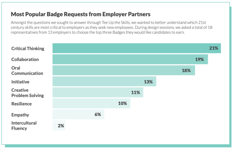 In the Fall of 2018, the Education Design Lab (Lab), launched Tee Up the Skills with seven two- and four-year colleges and universities across the U.S. The year-long pilot paired each school with at least one employer partner to understand how the Lab’s 21st Century Skills Digital Badges could improve students’ career readiness and serve as valuable signals for entry-level hiring. This paper outlines key milestones, tools and learnings from one year of testing with the Tee Up cohort.