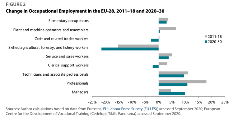 The high levels of unemployment wrought by the crisis, coupled with ongoing disruptions to global migration and travel, will make it harder to address the pervasive skills and labour challenges Europe was already facing before the pandemic hit. Several European countries are projected to experience a population contraction (as their residents age) and reduced labour supply (as older workers leave the workforce). At the same time, Europe’s skills needs are changing rapidly. The knowledge economy is growing quickly, and structural and technological changes are simultaneously driving a contraction in middle-skilled jobs and increasing demand for workers at both ends of skills spectrum—those in high-skilled ‘good’ jobs and in less-skilled, more precarious ‘bad’ jobs.