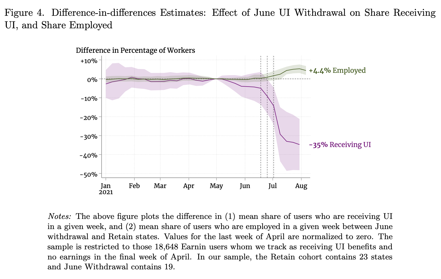 In our data through August 6, we find that ending pandemic UI increased employment by 4.4 percentage points while reducing UI recipiency by 35 percentage points among workers who were unemployed and receiving UI at the end of April 2021. Through the first week of August, average UI benefits for these workers fell by $278 per week and earnings rose by $14 per week, offsetting only 5% of the loss in income. Spending fell by $145 per week, as the loss of benefits led to a large immediate decline in consumption.