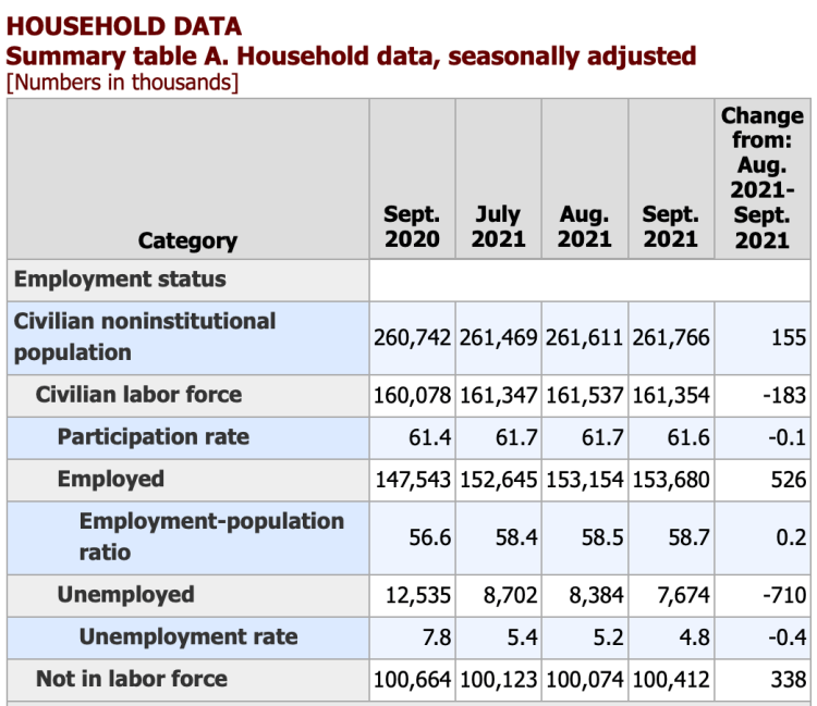 The unemployment rate fell by 0.4 percentage point to 4.8 percent in September. The number of unemployed persons fell by 710,000 to 7.7 million. Both measures are down considerably from their highs at the end of the February-April 2020 recession. However, they remain above their levels prior to the coronavirus (COVID-19) pandemic (3.5 percent and 5.7 million,respectively, in February 2020). (See table A-1. See the box note at the end of this news releasefor more information about how the household survey and its measures were affected by thecoronavirus pandemic.)