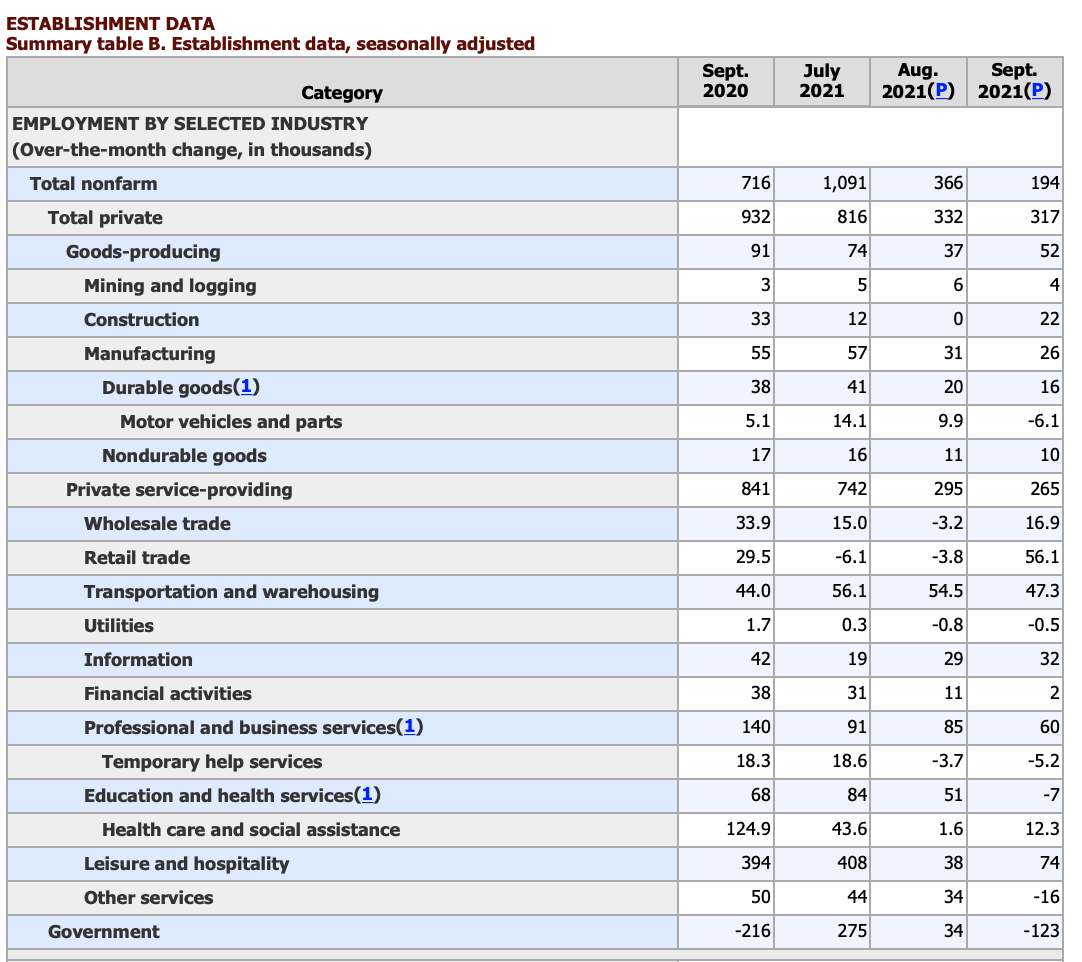 Total nonfarm payroll employment rose by 194,000 in September, and the unemployment rate fell by 0.4 percentage point to 4.8 percent, the U.S. Bureau of Labor Statistics reported today. Notable job gains occurred in leisure and hospitality, in professional and businessservices, in retail trade, and in transportation and warehousing. Employment in public education declined over the month.