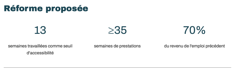- Réduire le seuil d’accessibilité aux prestations à 350 heures ou 13 semaines travaillées.