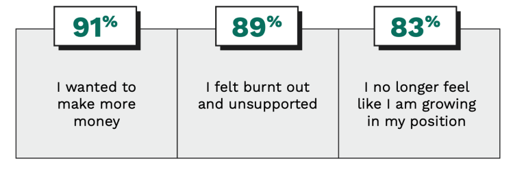 Workers are burnt out and want more pay. They are willing to make personal sacrifices to get a new lease on their professional lives. When asked to select the reasons why they had quit or planned to quit, the top responses were: