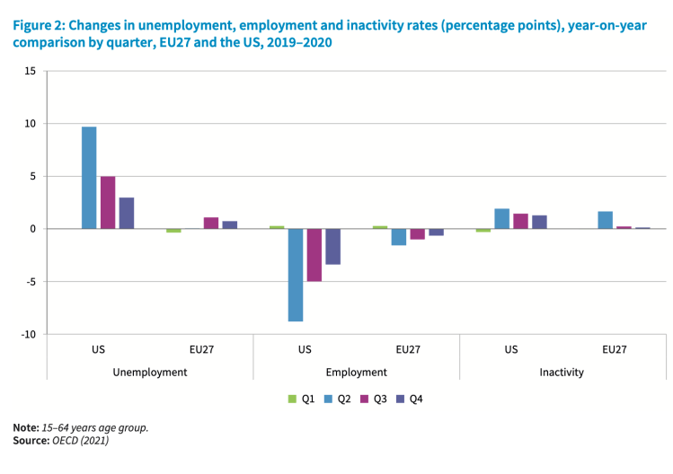 (2) rather than a fall in the EU’s employment headcount, the peak of the pandemic saw an increase in the share of employed workers not working; these ‘furloughed’ workers accounted for around two-thirds of the decline in hours worked at the height of the crisis; and state intervention and fiscal support proved crucial to protecting economies and labour markets in the face of this large, unanticipated shock;