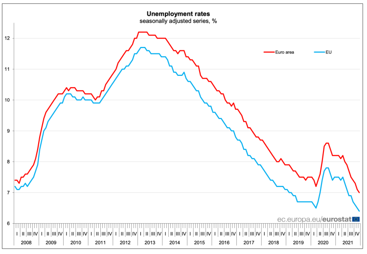 In December 2021, the euro area seasonally-adjusted unemployment rate was 7.0%, down from 7.1% in November 2021 and from 8.2% in December 2020. The EU unemployment rate was 6.4% in December 2021, down from 6.5% in November 2021 and from 7.5% in December 2020. These figures are published by Eurostat, the statistical office of the European Union.