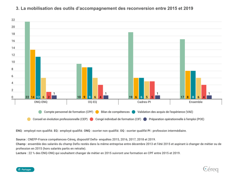 Entre 2015 et 2019, le taux de recours au CPF le plus important s’observe pour eux : 22 % contre 10 % des ouvriers et employés qualifiés. Or, avant la monétisation du CPF par la loi du 5 septembre 2018, le plafond de 150 heures prévu pour les salariés à temps plein continûment employés, au bout de huit ans, a représenté un niveau bien modeste pour entreprendre une reconversion sans moyen complémentaire. Si le CPF finance des formations plutôt courtes, la tendance s’inverse avec le CIF2, qui est la pierre angulaire d’une vision qui lie formation, promotion et mobilité sociale. Celui-ci a la particularité de permettre au salarié de suivre une formation de son choix sur le temps de travail, en conservant son poste ainsi que sa rémunération sur une durée d’un an, voire plus, selon les accords de branche. Mais seulement 2 % des ENQ-ONQ en ont bénéficié. C’est pourtant pour eux que de longues formations sont appelées à jouer un rôle central.